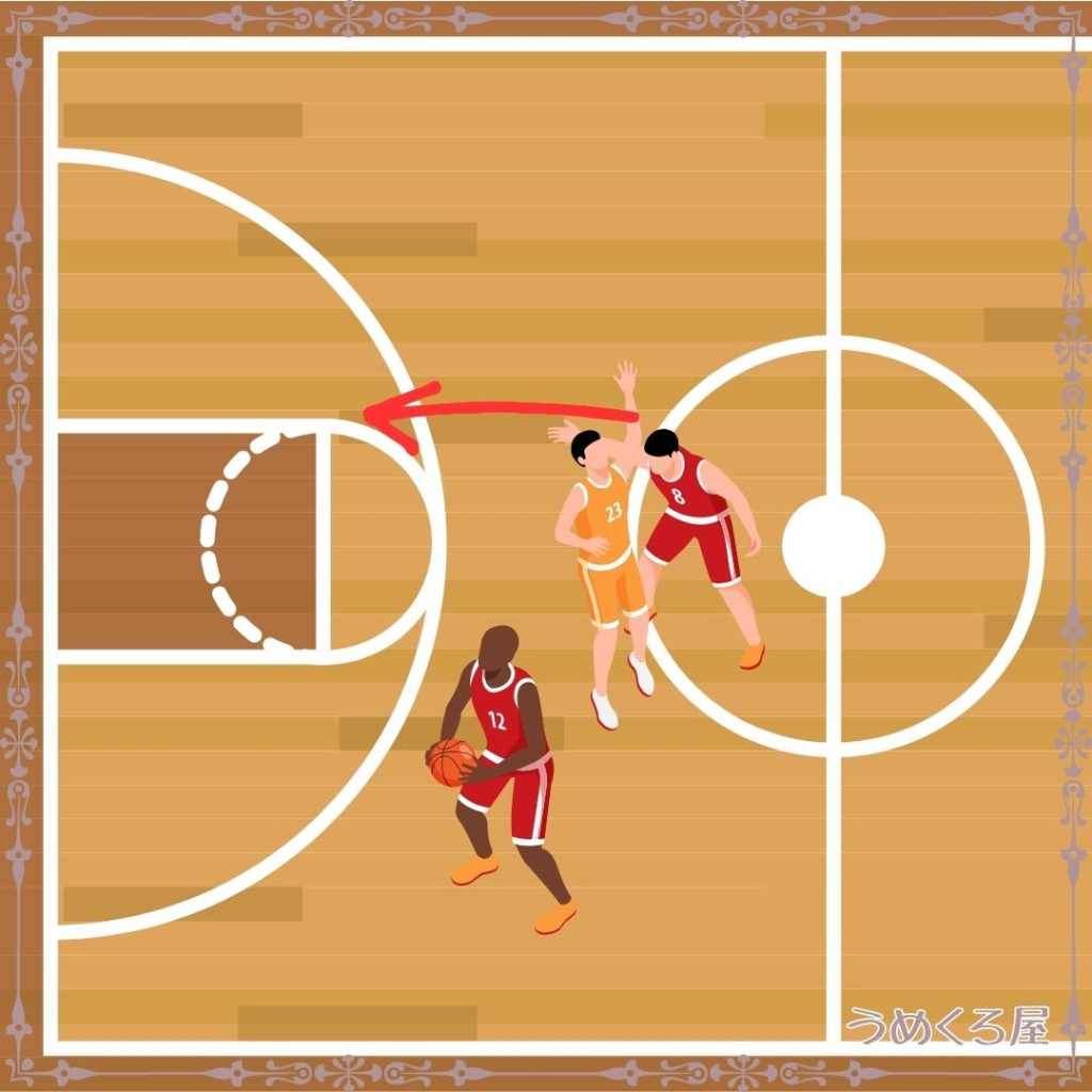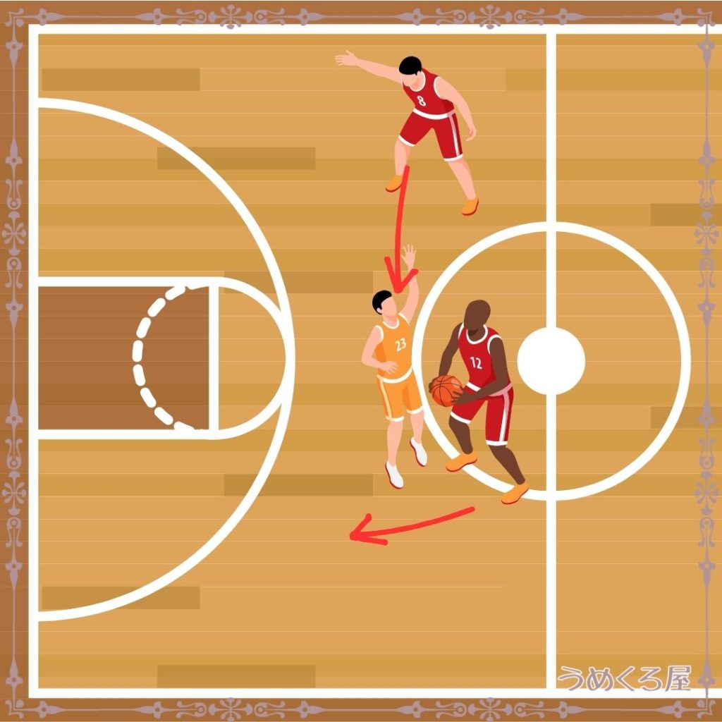 ボールを持っている選手に対して、ディフェンスしようとしている相手選手を、スクリーナーが壁を作ってディフェンスできないようにします。