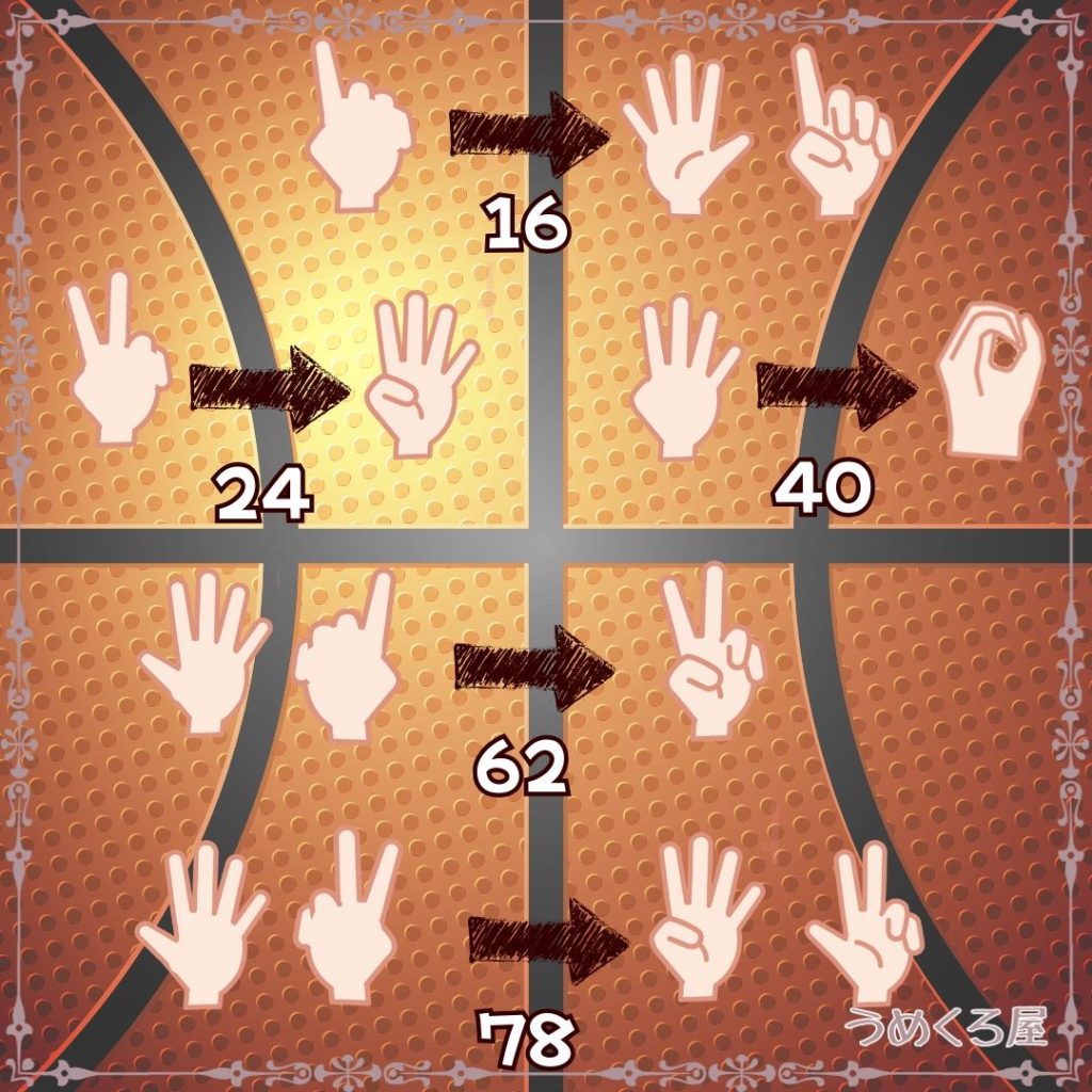 16以降は手の甲を見せた状態で10の位・手のひらを見せた状態で1の位を示します。