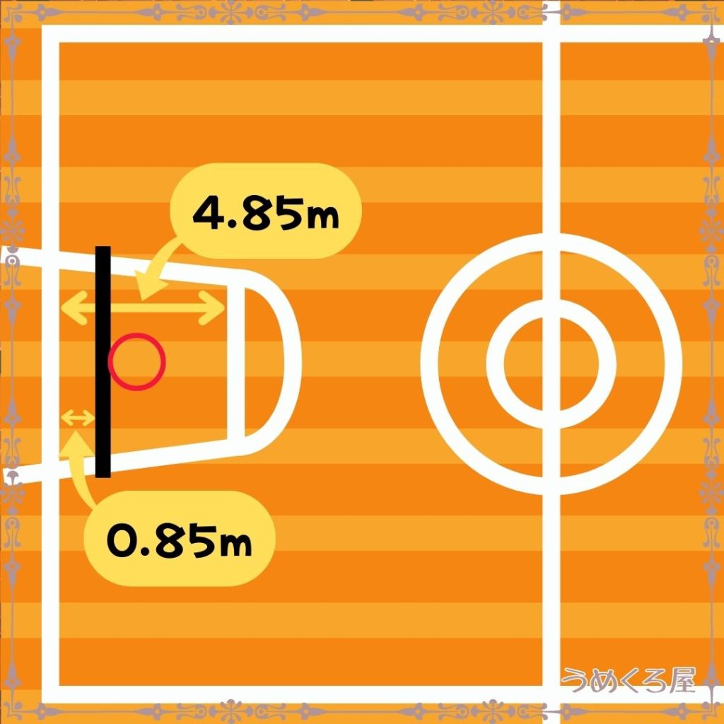 コートのサイズよりも、エンドラインからフリースローラインまでの距離が大事で、バスケが5.85mなのに対しミニバスは4.85mです。