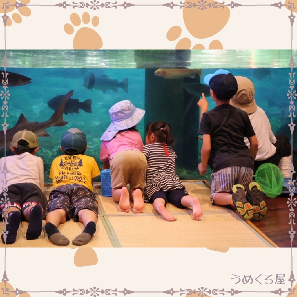 子どもたちは早速靴を脱いで、いつもと違う目線から魚を観察していました。