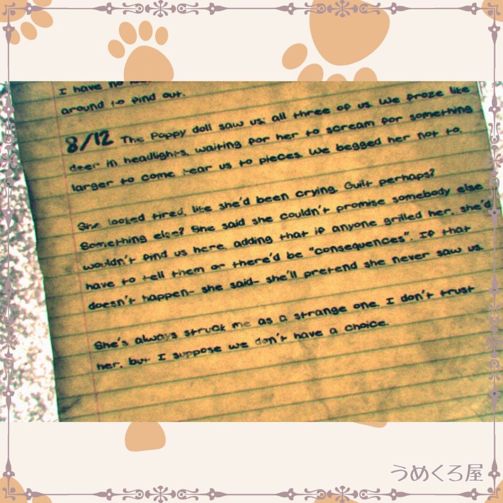 (8/12 ポピー人形が私たちを見た。3人全員だ。私たちは、彼女が叫び声を上げて、もっと巨大な「何か」を呼び寄せ、私たちをバラバラにするのを待つ間、ライトに照らされた鹿のように硬直した。私たちはそうしないでくれと彼女に懇願した。